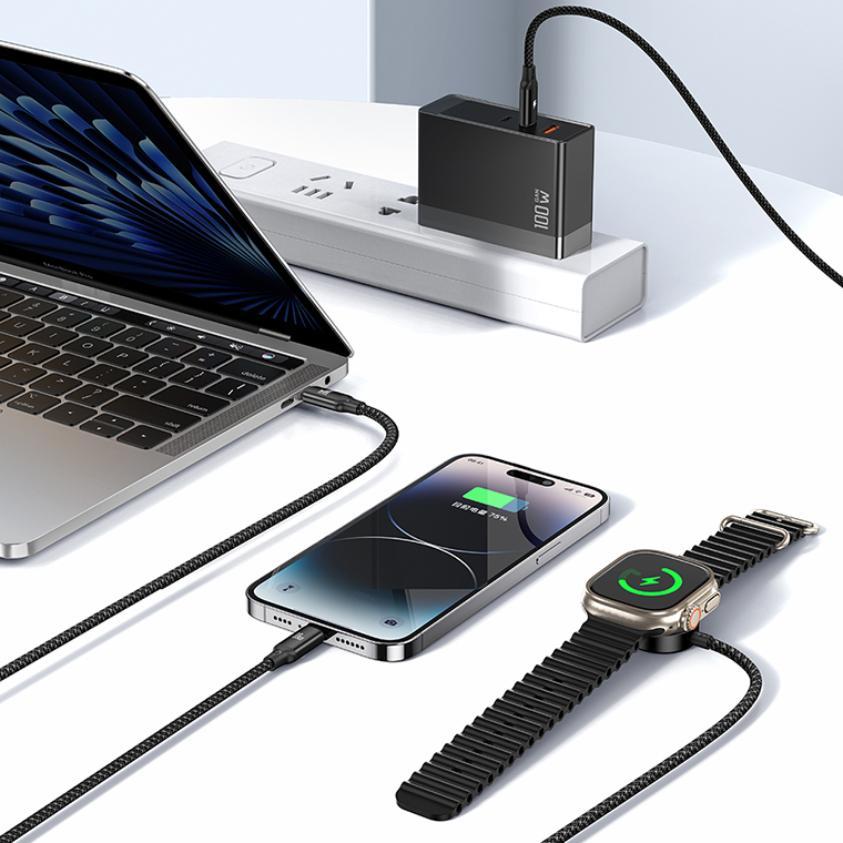 3 in1 100W USB-C to Type-C and Lightning+ Wireless Charger for Apple Watch Cable 1.2m