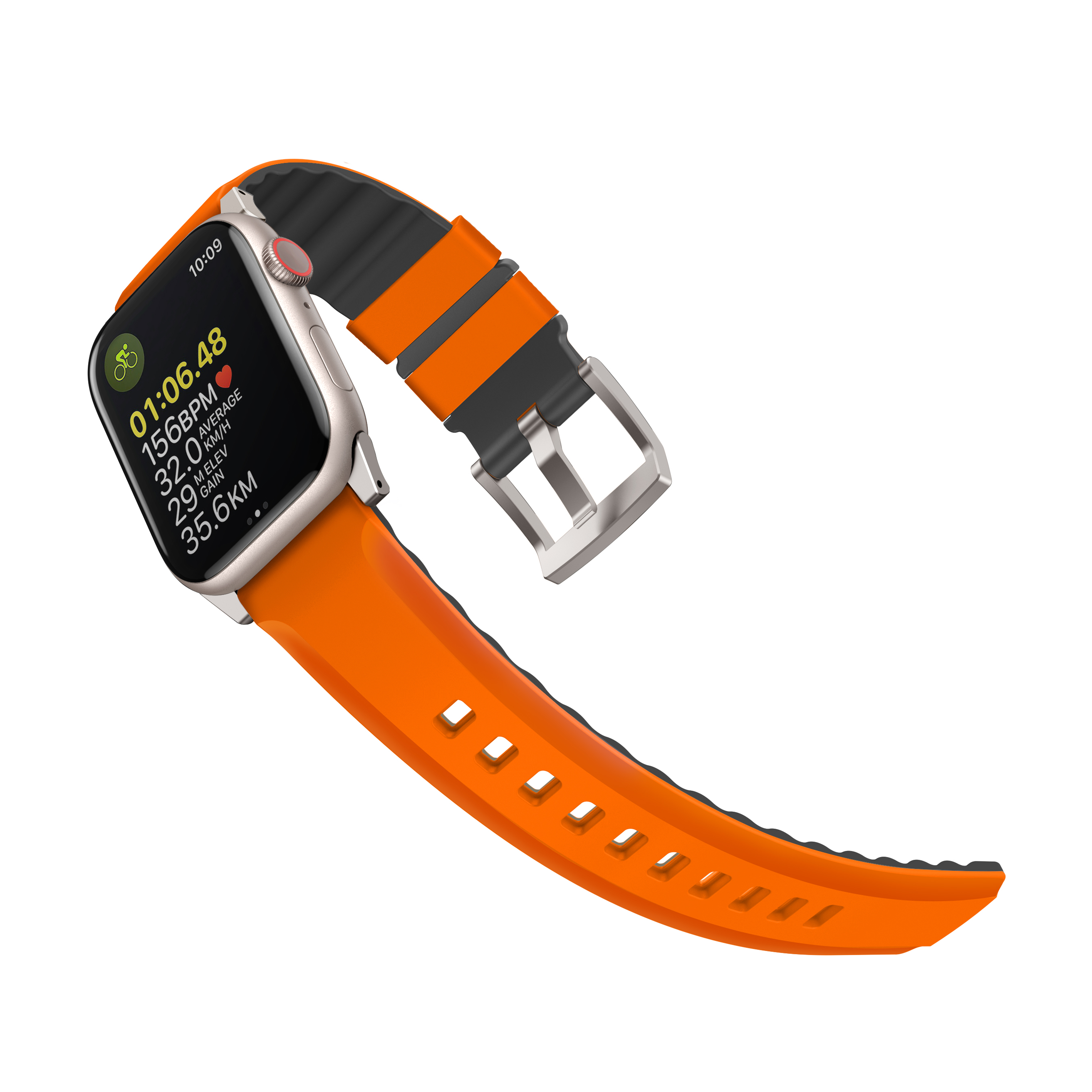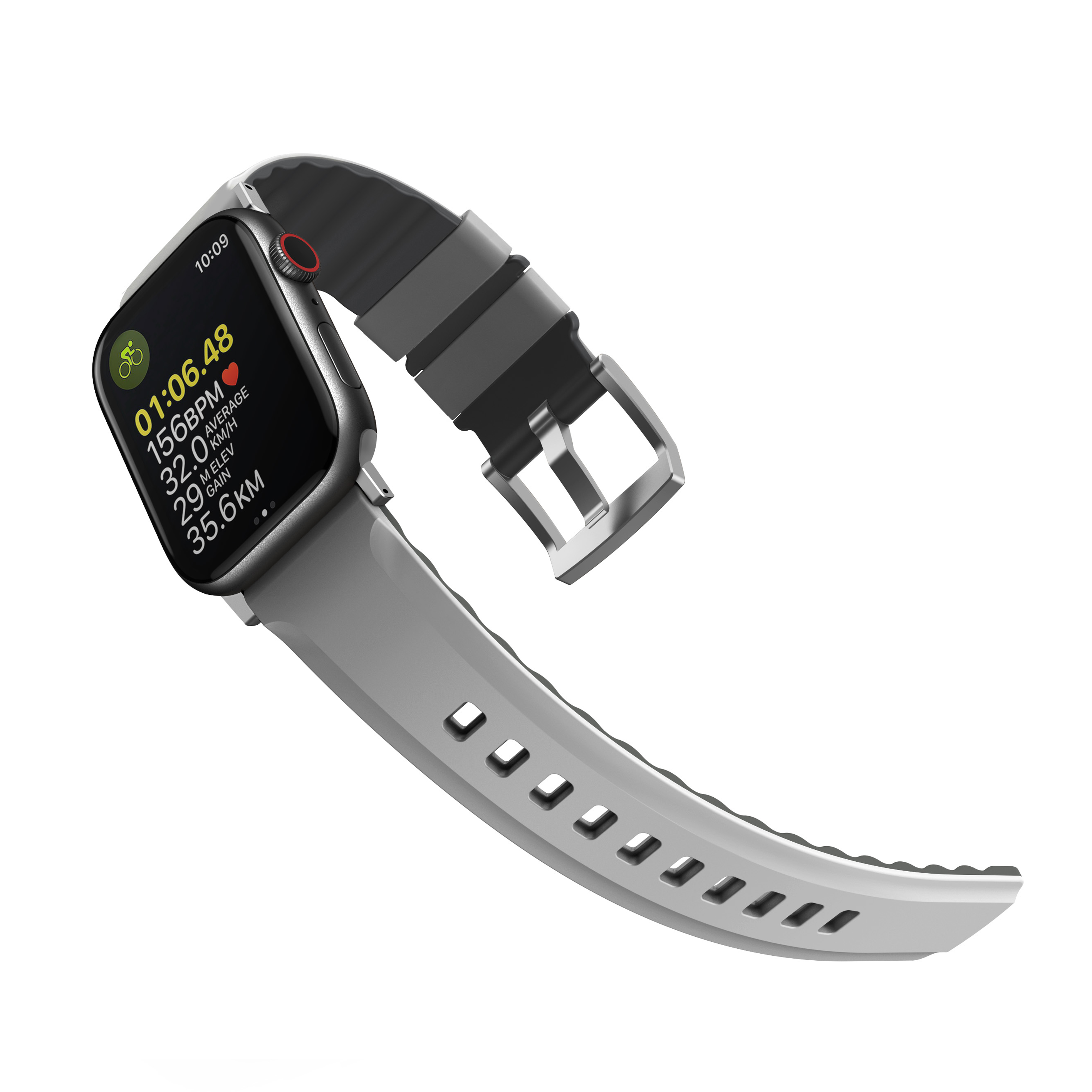 A waterproof strap with a breathable and lightweight design for urban and outdoor activities. Its innovative AiroSoft™ finish feels surprisingly soft and sits comfortably on your wrist. Made from flexible silicone with grooves on the underside for added ventilation during intense workouts. Adjustable fit with contrasting length adjustment cutouts and 304 stainless steel hardware.